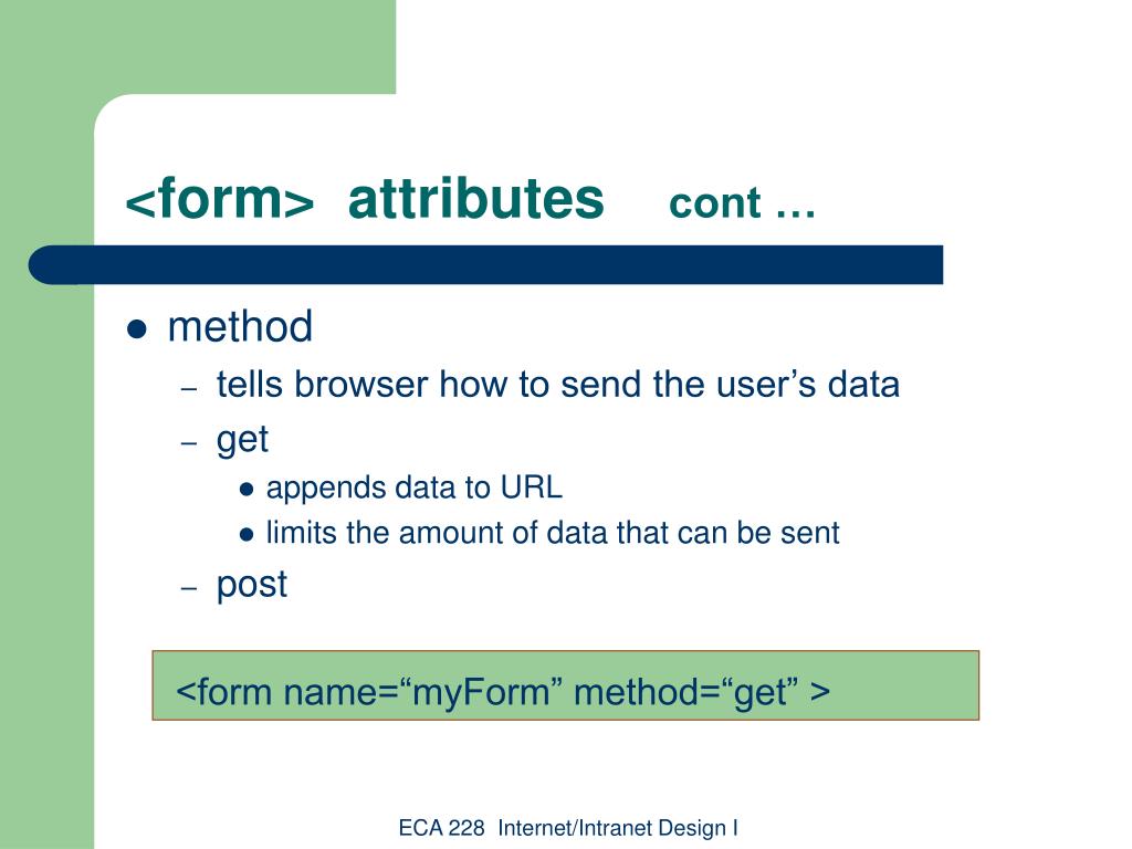 <form> attributes cont … • method • tells browser how to send the user’s data • get • appends data to URL • limits the amount of data that can be sent • post <form name=“myForm” method=“get” > ECA 228 Internet/Intranet Design I