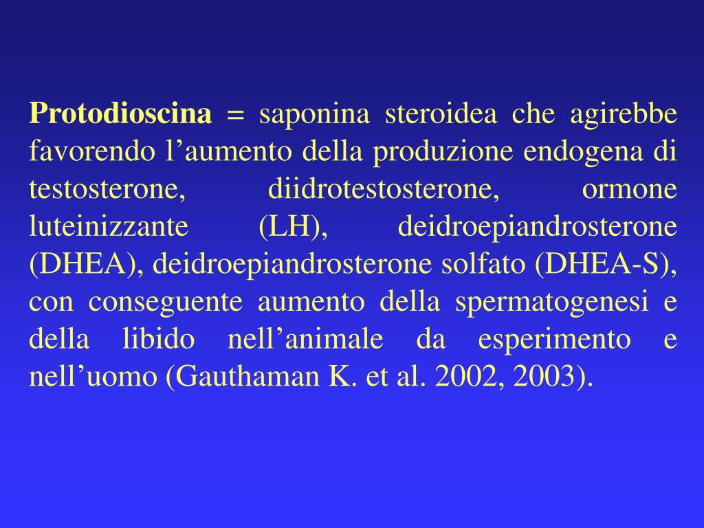 Protodioscina = saponina steroidea che agirebbe favorendo l’aumento della produzione endogena di testosterone, diidrotestosterone, ormone luteinizzante (LH), deidroepiandrosterone (DHEA), deidroepiandrosterone solfato (DHEA-S), con conseguente aumento della spermatogenesi e della libido nell’animale da esperimento e nell’uomo (Gauthaman K. et al. 2002, 2003).