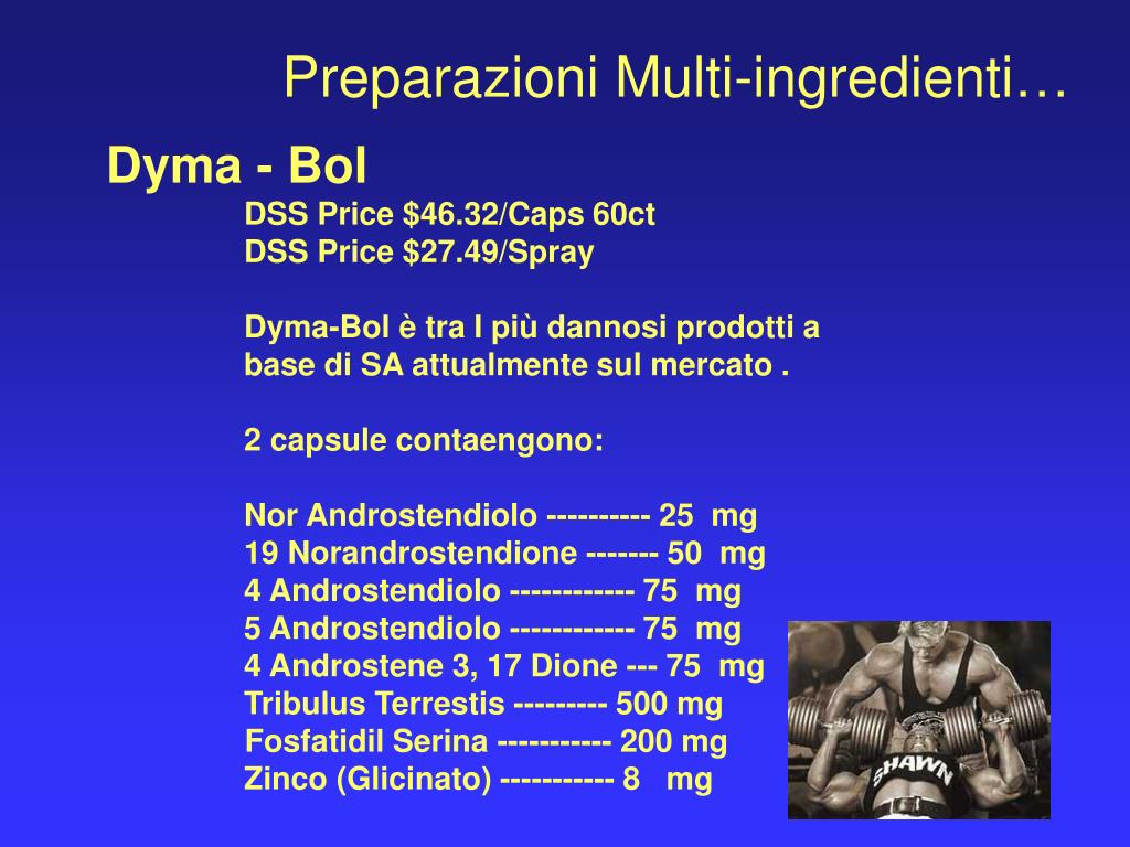 Preparazioni Multi-ingredienti… Dyma - Bol DSS Price $46.32/Caps 60ct DSS Price $27.49/Spray Dyma-Bol è tra I più dannosi prodotti a base di SA attualmente sul mercato . 2 capsule contaengono: Nor Androstendiolo ---------- 25 mg 19 Norandrostendione ------- 50 mg 4 Androstendiolo ------------ 75 mg 5 Androstendiolo ------------ 75 mg 4 Androstene 3, 17 Dione --- 75 mg Tribulus Terrestis --------- 500 mg Fosfatidil Serina ----------- 200 mg Zinco (Glicinato) ----------- 8 mg