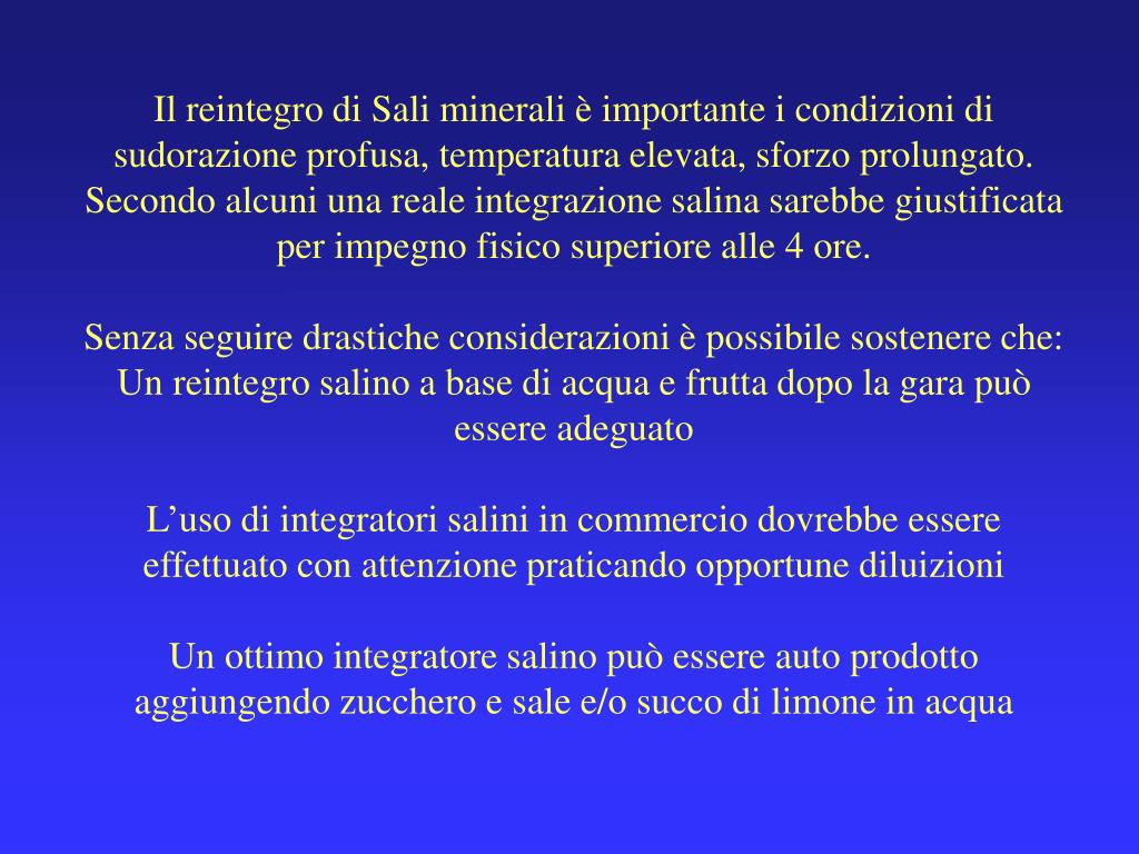 Il reintegro di Sali minerali è importante i condizioni di sudorazione profusa, temperatura elevata, sforzo prolungato. Secondo alcuni una reale integrazione salina sarebbe giustificata per impegno fisico superiore alle 4 ore. Senza seguire drastiche considerazioni è possibile sostenere che: Un reintegro salino a base di acqua e frutta dopo la gara può essere adeguato L’uso di integratori salini in commercio dovrebbe essere effettuato con attenzione praticando opportune diluizioni Un ottimo integratore salino può essere auto prodotto aggiungendo zucchero e sale e/o succo di limone in acqua