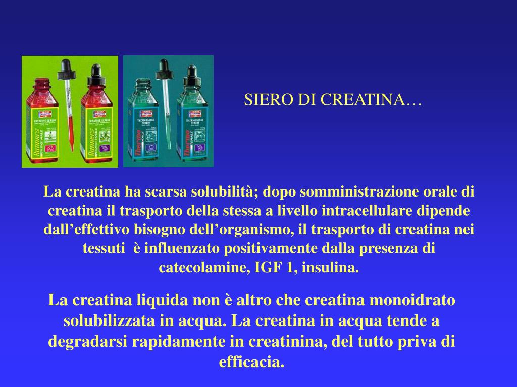 SIERO DI CREATINA… La creatina ha scarsa solubilità; dopo somministrazione orale di creatina il trasporto della stessa a livello intracellulare dipende dall’effettivo bisogno dell’organismo, il trasporto di creatina nei tessuti è influenzato positivamente dalla presenza di catecolamine, IGF 1, insulina. La creatina liquida non è altro che creatina monoidrato solubilizzata in acqua. La creatina in acqua tende a degradarsi rapidamente in creatinina, del tutto priva di efficacia.