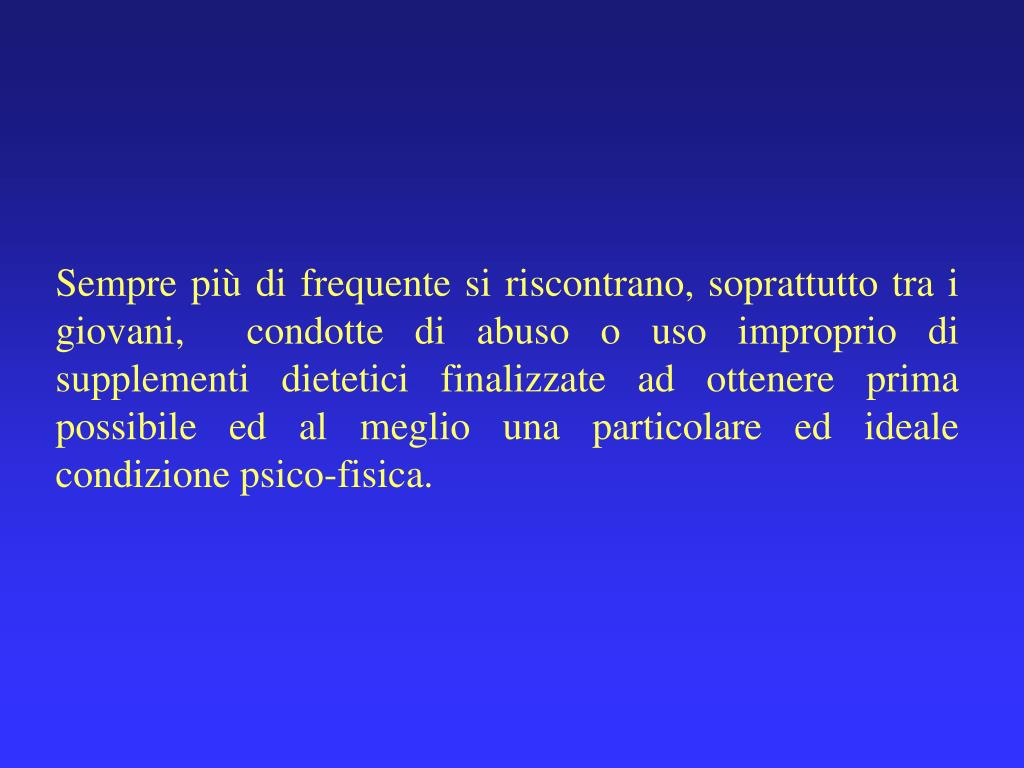 Sempre più di frequente si riscontrano, soprattutto tra i giovani, condotte di abuso o uso improprio di supplementi dietetici finalizzate ad ottenere prima possibile ed al meglio una particolare ed ideale condizione psico-fisica.