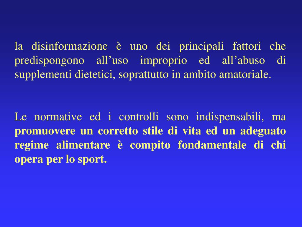 la disinformazione è uno dei principali fattori che predispongono all’uso improprio ed all’abuso di supplementi dietetici, soprattutto in ambito amatoriale. Le normative ed i controlli sono indispensabili, ma promuovere un corretto stile di vita ed un adeguato regime alimentare è compito fondamentale di chi opera per lo sport.