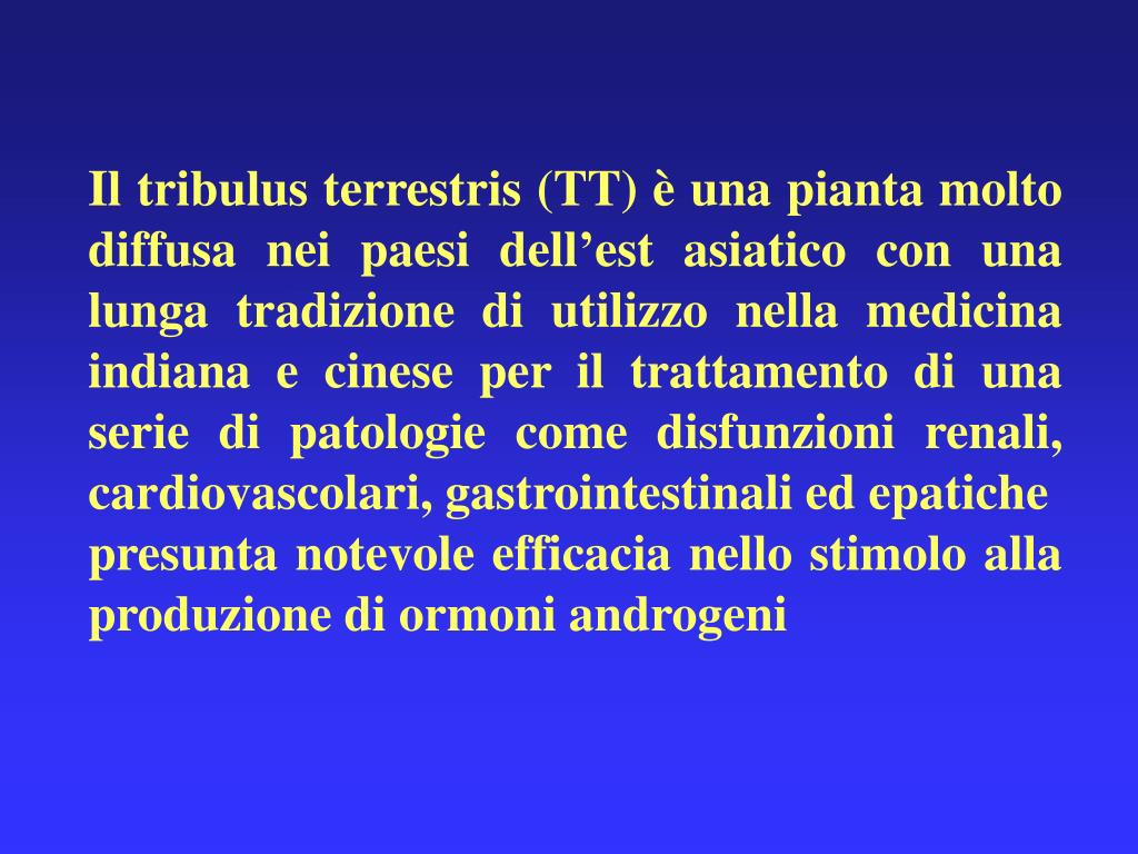 Il tribulus terrestris (TT) è una pianta molto diffusa nei paesi dell’est asiatico con una lunga tradizione di utilizzo nella medicina indiana e cinese per il trattamento di una serie di patologie come disfunzioni renali, cardiovascolari, gastrointestinali ed epatiche presunta notevole efficacia nello stimolo alla produzione di ormoni androgeni