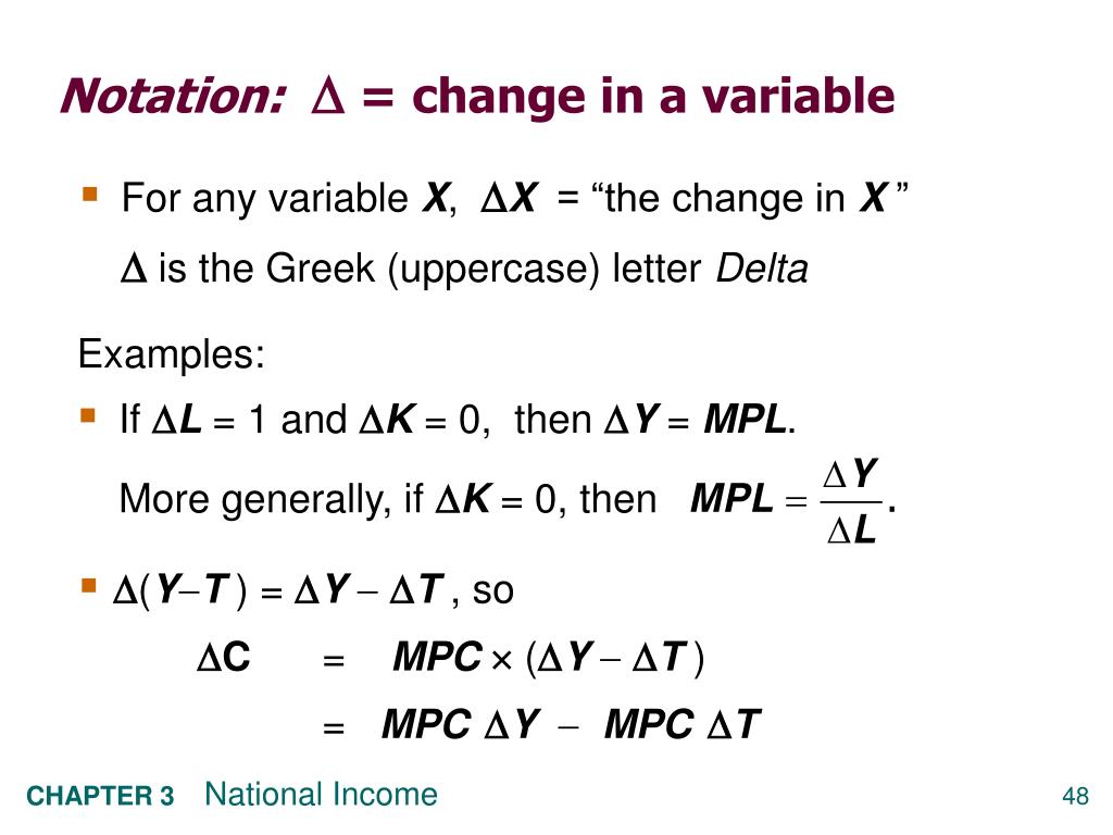 Notation: = change in a variable • For any variable X, X = “the change in X ” is the Greek (uppercase) letter Delta Examples: • If L = 1 and K = 0, then Y = MPL. More generally, if K = 0, then • (YT )= Y T , so C = MPC (Y T ) = MPC Y MPC T