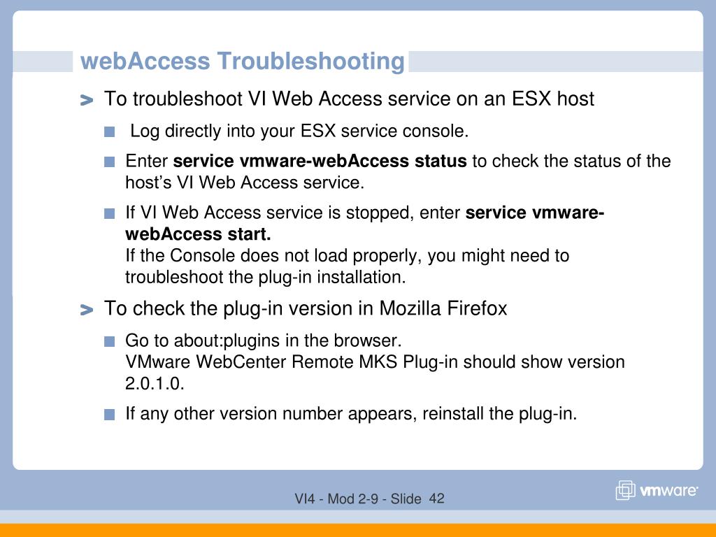 webAccess Troubleshooting To troubleshoot VI Web Access service on an ESX host Log directly into your ESX service console. Enter service vmware-webAccess status to check the status of the host’s VI Web Access service. If VI Web Access service is stopped, enter service vmware-webAccess start.If the Console does not load properly, you might need to troubleshoot the plug-in installation. To check the plug-in version in Mozilla Firefox Go to about:plugins in the browser.VMware WebCenter Remote MKS Plug-in should show version 2.0.1.0. If any other version number appears, reinstall the plug-in. VI4 - Mod 2-9 - Slide