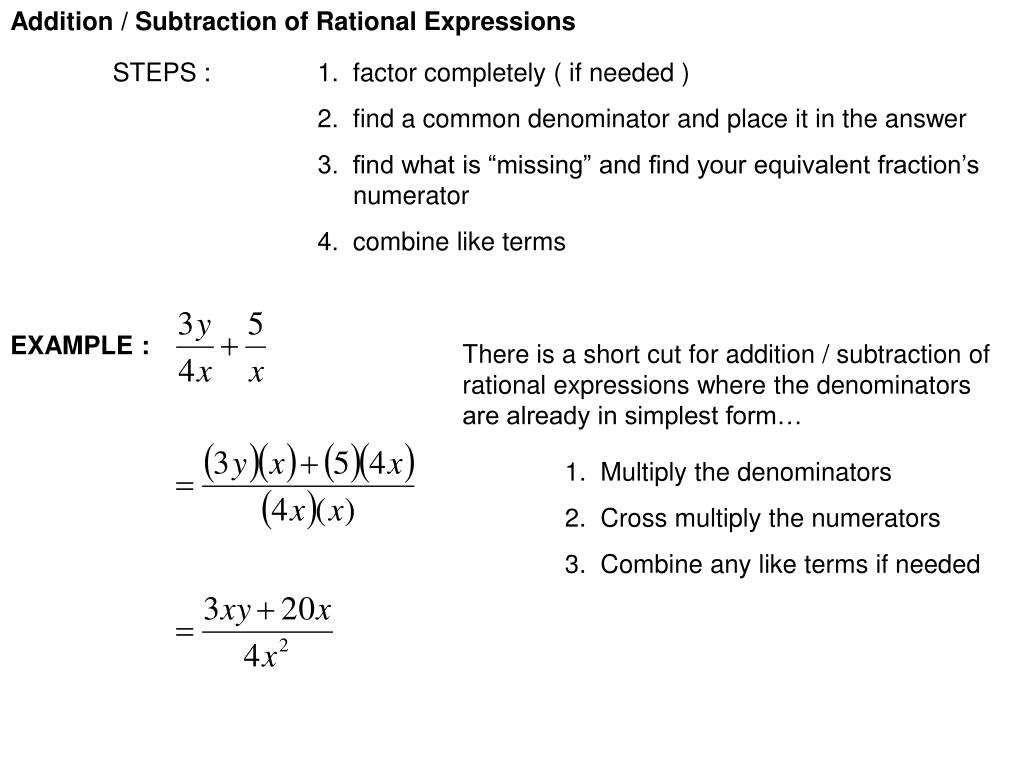 Addition / Subtraction of Rational Expressions. STEPS : 1. factor completely ( if needed ) 2. find a common denominator and place it in the answer 3. find what is “missing” and find your equivalent fraction’s numerator 4. combine like terms.