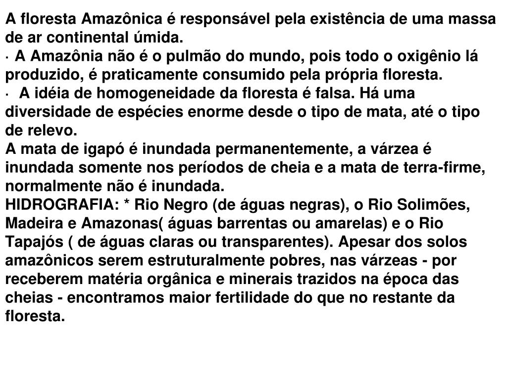 A floresta Amazônica é responsável pela existência de uma massa de ar continental úmida. · A Amazônia não é o pulmão do mundo, pois todo o oxigênio lá produzido, é praticamente consumido pela própria floresta. · A idéia de homogeneidade da floresta é falsa. Há uma diversidade de espécies enorme desde o tipo de mata, até o tipo de relevo. A mata de igapó é inundada permanentemente, a várzea é inundada somente nos períodos de cheia e a mata de terra-firme, normalmente não é inundada.HIDROGRAFIA: * Rio Negro (de águas negras), o Rio Solimões, Madeira e Amazonas( águas barrentas ou amarelas) e o Rio Tapajós ( de águas claras ou transparentes). Apesar dos solos amazônicos serem estruturalmente pobres, nas várzeas - por receberem matéria orgânica e minerais trazidos na época das cheias - encontramos maior fertilidade do que no restante da floresta.