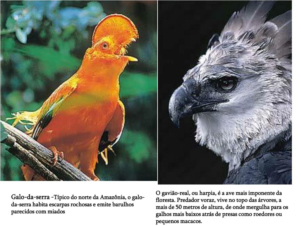 O gavião-real, ou harpia, é a ave mais imponente da floresta. Predador voraz, vive no topo das árvores, a mais de 50 metros de altura, de onde mergulha para os galhos mais baixos atrás de presas como roedores ou pequenos macacos. Galo-da-serra -Típico do norte da Amazônia, o galo-da-serra habita escarpas rochosas e emite barulhos parecidos com miados