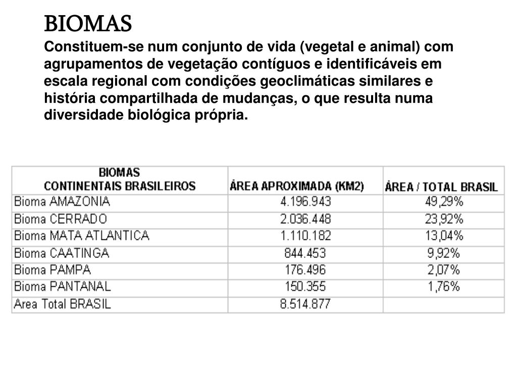 BIOMASConstituem-se num conjunto de vida (vegetal e animal) com agrupamentos de vegetação contíguos e identificáveis em escala regional com condições geoclimáticas similares e história compartilhada de mudanças, o que resulta numa diversidade biológica própria.