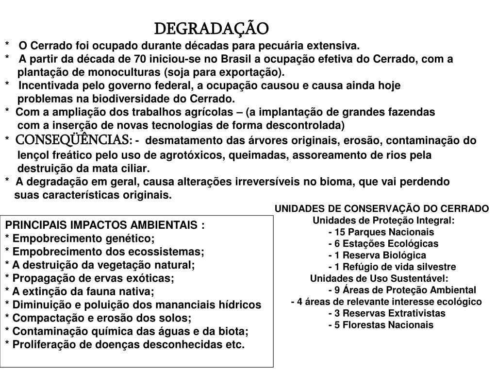 DEGRADAÇÃO* O Cerrado foi ocupado durante décadas para pecuária extensiva.* A partir da década de 70 iniciou-se no Brasil a ocupação efetiva do Cerrado, com a plantação de monoculturas (soja para exportação). * Incentivada pelo governo federal, a ocupação causou e causa ainda hoje problemas na biodiversidade do Cerrado. * Com a ampliação dos trabalhos agrícolas – (a implantação de grandes fazendas com a inserção de novas tecnologias de forma descontrolada)* CONSEQÜÊNCIAS: - desmatamento das árvores originais, erosão, contaminação do lençol freático pelo uso de agrotóxicos, queimadas, assoreamento de rios pela destruição da mata ciliar. * A degradação em geral, causa alterações irreversíveis no bioma, que vai perdendo suas características originais. UNIDADES DE CONSERVAÇÃO DO CERRADO Unidades de Proteção Integral: - 15 Parques Nacionais - 6 Estações Ecológicas - 1 Reserva Biológica - 1 Refúgio de vida silvestre Unidades de Uso Sustentável: - 9 Áreas de Proteção Ambiental - 4 áreas de relevante interesse ecológico - 3 Reservas Extrativistas - 5 Florestas Nacionais PRINCIPAIS IMPACTOS AMBIENTAIS :* Empobrecimento genético;* Empobrecimento dos ecossistemas;* A destruição da vegetação natural;* Propagação de ervas exóticas;* A extinção da fauna nativa;* Diminuição e poluição dos mananciais hídricos* Compactação e erosão dos solos;* Contaminação química das águas e da biota;* Proliferação de doenças desconhecidas etc.