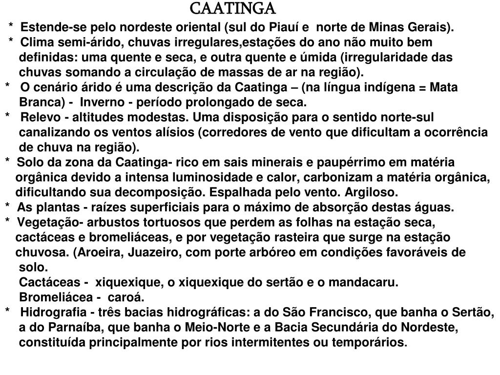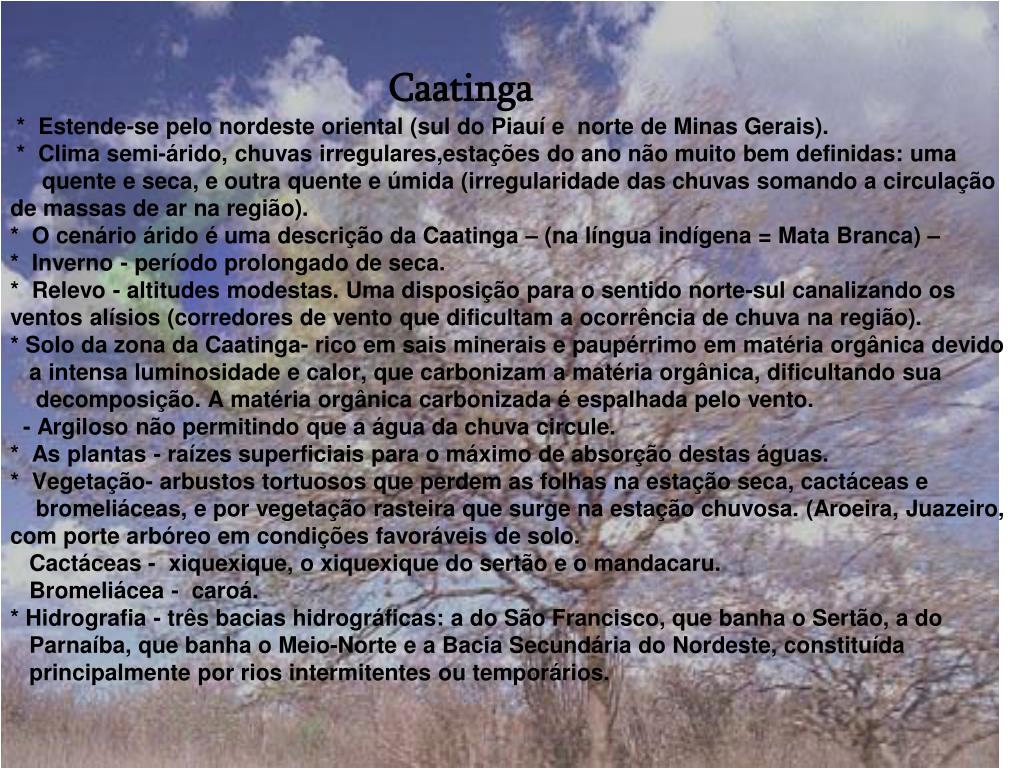 Caatinga * Estende-se pelo nordeste oriental (sul do Piauí e norte de Minas Gerais). * Clima semi-árido, chuvas irregulares,estações do ano não muito bem definidas: uma quente e seca, e outra quente e úmida (irregularidade das chuvas somando a circulação de massas de ar na região).* O cenário árido é uma descrição da Caatinga – (na língua indígena = Mata Branca) – * Inverno - período prolongado de seca. * Relevo - altitudes modestas. Uma disposição para o sentido norte-sul canalizando os ventos alísios (corredores de vento que dificultam a ocorrência de chuva na região).* Solo da zona da Caatinga- rico em sais minerais e paupérrimo em matéria orgânica devido a intensa luminosidade e calor, que carbonizam a matéria orgânica, dificultando sua decomposição. A matéria orgânica carbonizada é espalhada pelo vento. - Argiloso não permitindo que a água da chuva circule.* As plantas - raízes superficiais para o máximo de absorção destas águas. * Vegetação- arbustos tortuosos que perdem as folhas na estação seca, cactáceas e bromeliáceas, e por vegetação rasteira que surge na estação chuvosa. (Aroeira, Juazeiro, com porte arbóreo em condições favoráveis de solo. Cactáceas - xiquexique, o xiquexique do sertão e o mandacaru. Bromeliácea - caroá. * Hidrografia - três bacias hidrográficas: a do São Francisco, que banha o Sertão, a do Parnaíba, que banha o Meio-Norte e a Bacia Secundária do Nordeste, constituída principalmente por rios intermitentes ou temporários.