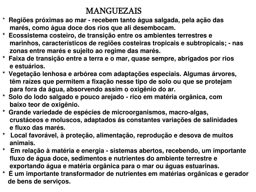 MANGUEZAIS* Regiões próximas ao mar - recebem tanto água salgada, pela ação das marés, como água doce dos rios que ali desembocam. * Ecossistema costeiro, de transição entre os ambientes terrestres e marinhos, característicos de regiões costeiras tropicais e subtropicais; - nas zonas entre marés e sujeito ao regime das marés. * Faixa de transição entre a terra e o mar, quase sempre, abrigados por rios e estuários.* Vegetação lenhosa e arbórea com adaptações especiais. Algumas árvores, têm raízes que permitem a fixação nesse tipo de solo ou que se protejam para fora da água, absorvendo assim o oxigênio do ar. * Solo do lodo salgado e pouco arejado - rico em matéria orgânica, com baixo teor de oxigênio.* Grande variedade de espécies de microorganismos, macro-algas, crustáceos e moluscos, adaptados ás constantes variações de salinidades e fluxo das marés. * Local favorável, à proteção, alimentação, reprodução e desova de muitos animais. * Em relação à matéria e energia - sistemas abertos, recebendo, um importante fluxo de água doce, sedimentos e nutrientes do ambiente terrestre e exportando água e matéria orgânica para o mar ou águas estuarinas. * É um importante transformador de nutrientes em matérias orgânicas e gerador de bens de serviços.