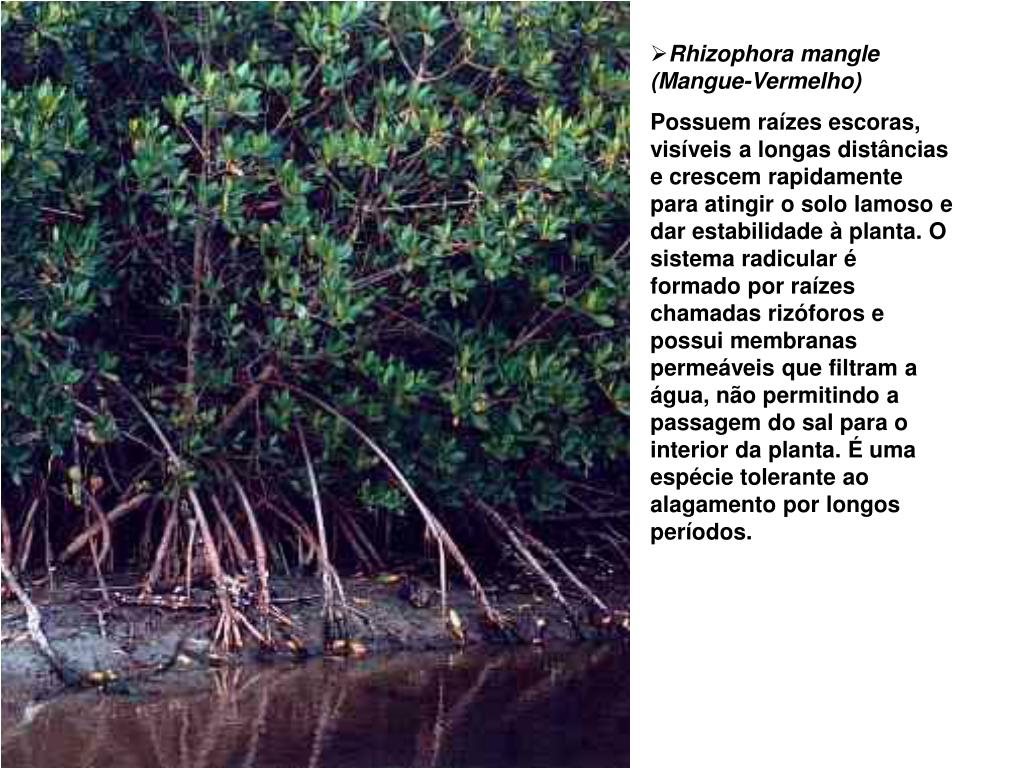 Rhizophora mangle (Mangue-Vermelho) • Possuem raízes escoras, visíveis a longas distâncias e crescem rapidamente para atingir o solo lamoso e dar estabilidade à planta. O sistema radicular é formado por raízes chamadas rizóforos e possui membranas permeáveis que filtram a água, não permitindo a passagem do sal para o interior da planta. É uma espécie tolerante ao alagamento por longos períodos.