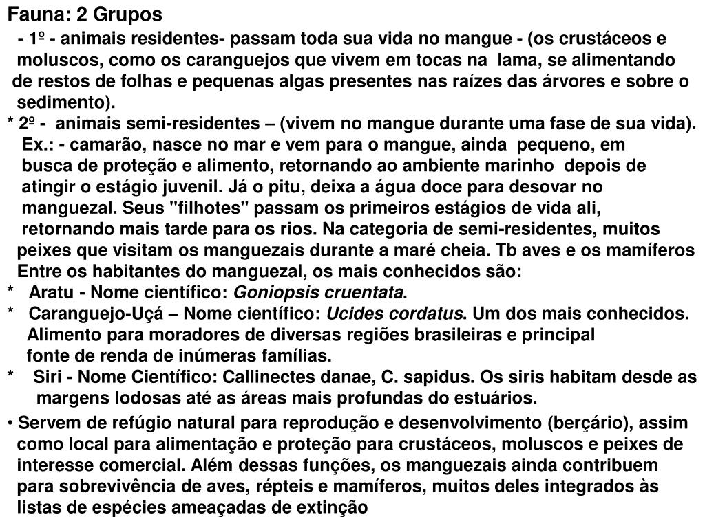 Fauna: 2 Grupos- 1º - animais residentes- passam toda sua vida no mangue - (os crustáceos e moluscos, como os caranguejos que vivem em tocas na lama, se alimentando de restos de folhas e pequenas algas presentes nas raízes das árvores e sobre o sedimento). * 2º - animais semi-residentes – (vivem no mangue durante uma fase de sua vida). Ex.: - camarão, nasce no mar e vem para o mangue, ainda pequeno, em busca de proteção e alimento, retornando ao ambiente marinho depois de atingir o estágio juvenil. Já o pitu, deixa a água doce para desovar no manguezal. Seus "filhotes" passam os primeiros estágios de vida ali, retornando mais tarde para os rios. Na categoria de semi-residentes, muitos peixes que visitam os manguezais durante a maré cheia. Tb aves e os mamíferos Entre os habitantes do manguezal, os mais conhecidos são:* Aratu - Nome científico: Goniopsis cruentata.* Caranguejo-Uçá – Nome científico: Ucidescordatus. Um dos mais conhecidos. Alimento para moradores de diversas regiões brasileiras e principal fonte de renda de inúmeras famílias.* Siri - Nome Científico: Callinectes danae, C. sapidus. Os siris habitam desde as margens lodosas até as áreas mais profundas do estuários. • Servem de refúgio natural para reprodução e desenvolvimento (berçário), assim como local para alimentação e proteção para crustáceos, moluscos e peixes de interesse comercial. Além dessas funções, os manguezais ainda contribuem para sobrevivência de aves, répteis e mamíferos, muitos deles integrados às listas de espécies ameaçadas de extinção