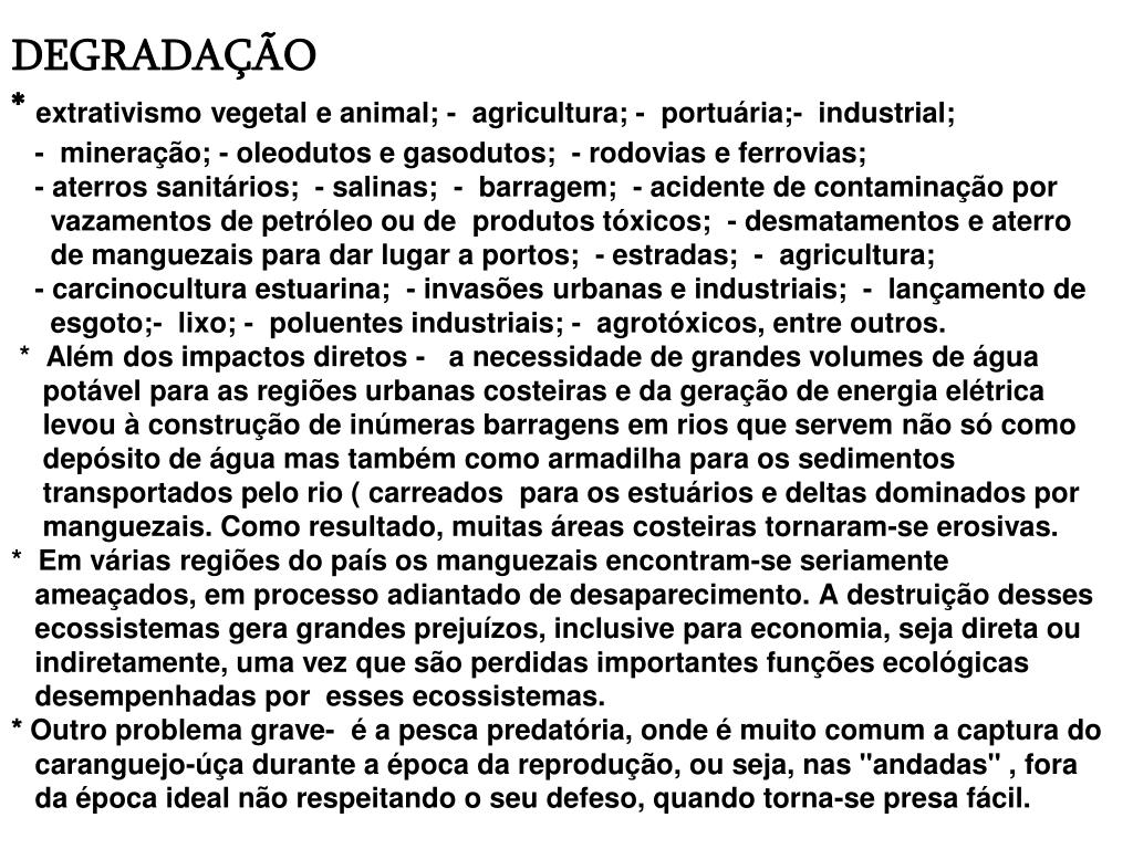 DEGRADAÇÃO* extrativismo vegetal e animal; - agricultura; - portuária;- industrial; - mineração; - oleodutos e gasodutos; - rodovias e ferrovias; - aterros sanitários; - salinas; - barragem; - acidente de contaminação por vazamentos de petróleo ou de produtos tóxicos; - desmatamentos e aterro de manguezais para dar lugar a portos; - estradas; - agricultura; - carcinocultura estuarina; - invasões urbanas e industriais; - lançamento de esgoto;- lixo; - poluentes industriais; - agrotóxicos, entre outros. * Além dos impactos diretos - a necessidade de grandes volumes de água potável para as regiões urbanas costeiras e da geração de energia elétrica levou à construção de inúmeras barragens em rios que servem não só como depósito de água mas também como armadilha para os sedimentos transportados pelo rio ( carreados para os estuários e deltas dominados por manguezais. Como resultado, muitas áreas costeiras tornaram-se erosivas.* Em várias regiões do país os manguezais encontram-se seriamente ameaçados, em processo adiantado de desaparecimento. A destruição desses ecossistemas gera grandes prejuízos, inclusive para economia, seja direta ou indiretamente, uma vez que são perdidas importantes funções ecológicas desempenhadas por esses ecossistemas.* Outro problema grave- é a pesca predatória, onde é muito comum a captura do caranguejo-úça durante a época da reprodução, ou seja, nas "andadas" , fora da época ideal não respeitando o seu defeso, quando torna-se presa fácil.