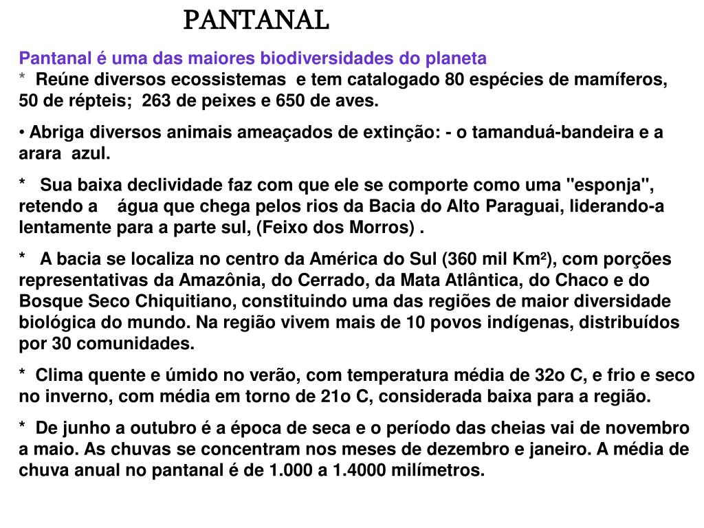 PANTANAL • Pantanal é uma das maiores biodiversidades do planeta * Reúne diversos ecossistemas e tem catalogado 80 espécies de mamíferos, 50 de répteis; 263 de peixes e 650 de aves. • Abriga diversos animais ameaçados de extinção: - o tamanduá-bandeira e a arara azul. * Sua baixa declividade faz com que ele se comporte como uma "esponja", retendo a água que chega pelos rios da Bacia do Alto Paraguai, liderando-a lentamente para a parte sul, (Feixo dos Morros) . * A bacia se localiza no centro da América do Sul (360 mil Km²), com porções representativas da Amazônia, do Cerrado, da Mata Atlântica, do Chaco e do Bosque Seco Chiquitiano, constituindo uma das regiões de maior diversidade biológica do mundo. Na região vivem mais de 10 povos indígenas, distribuídos por 30 comunidades. * Clima quente e úmido no verão, com temperatura média de 32o C, e frio e seco no inverno, com média em torno de 21o C, considerada baixa para a região. * De junho a outubro é a época de seca e o período das cheias vai de novembro a maio. As chuvas se concentram nos meses de dezembro e janeiro. A média de chuva anual no pantanal é de 1.000 a 1.4000 milímetros.