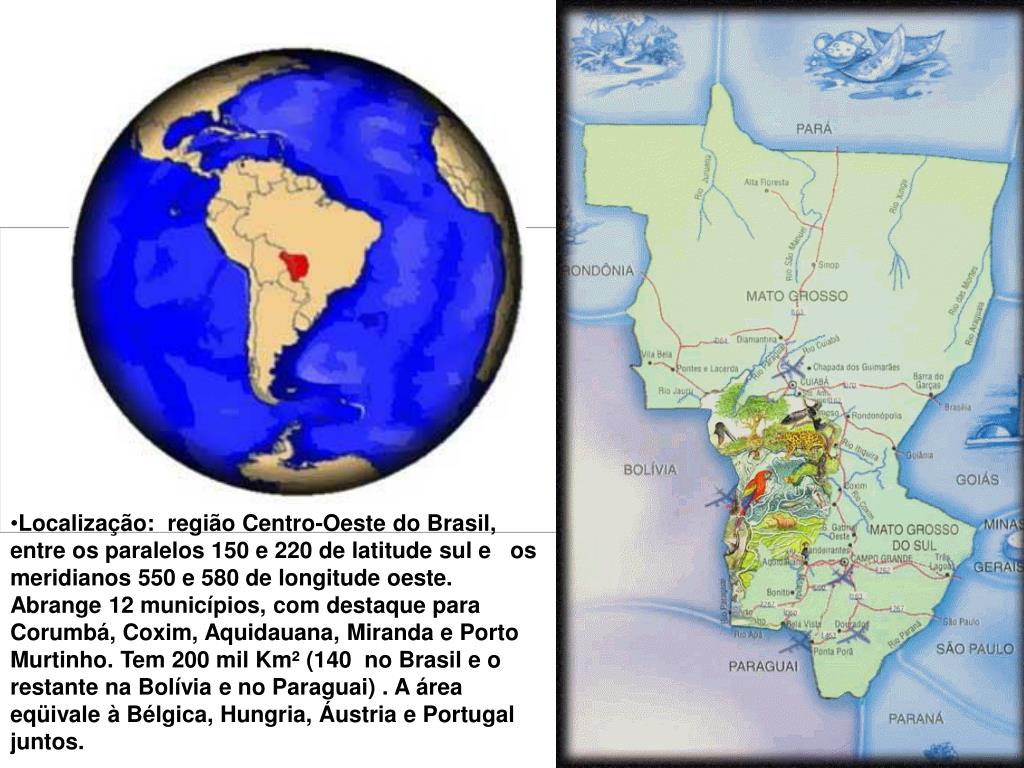 Localização: região Centro-Oeste do Brasil, entre os paralelos 150 e 220 de latitude sul e os meridianos 550 e 580 de longitude oeste. Abrange 12 municípios, com destaque para Corumbá, Coxim, Aquidauana, Miranda e Porto Murtinho. Tem 200 mil Km² (140 no Brasil e o restante na Bolívia e no Paraguai) . A área eqüivale à Bélgica, Hungria, Áustria e Portugal juntos.