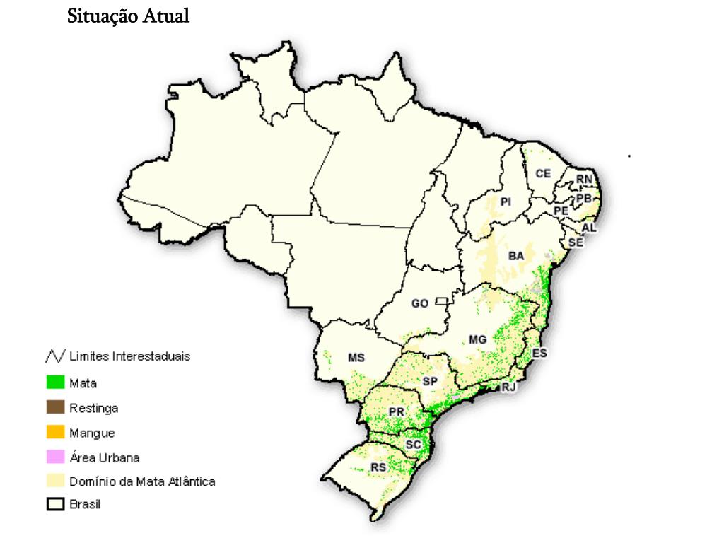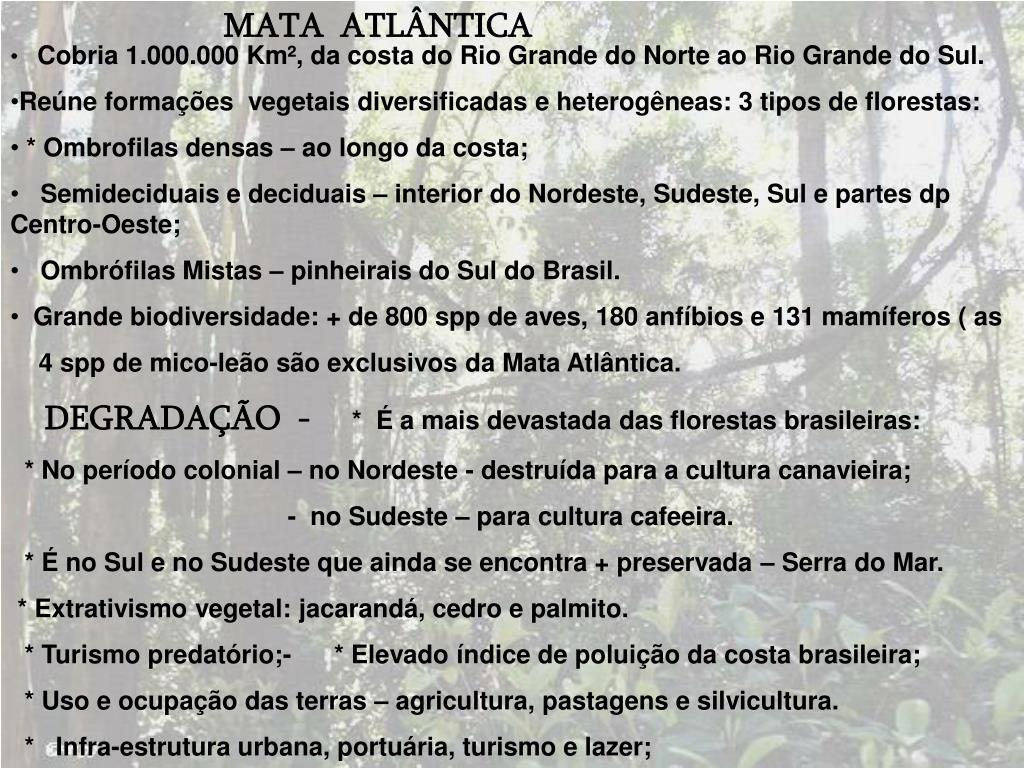 MATA ATLÂNTICA • Cobria 1.000.000 Km², da costa do Rio Grande do Norte ao Rio Grande do Sul. • Reúne formações vegetais diversificadas e heterogêneas: 3 tipos de florestas: • Ombrofilas densas – ao longo da costa; • Semideciduais e deciduais – interior do Nordeste, Sudeste, Sul e partes do Centro-Oeste; • Ombrófilas Mistas – pinheirais do Sul do Brasil. • Grande biodiversidade: + de 800 spp de aves, 180 anfíbios e 131 mamíferos as 4 spp de mico-leão são exclusivos da Mata Atlântica. DEGRADAÇÃO - * É a mais devastada das florestas brasileiras: * No período colonial – no Nordeste - destruída para a cultura canavieira; - no Sudeste – para cultura cafeeira. * É no Sul e no Sudeste que ainda se encontra + preservada – Serra do Mar. * Extrativismo vegetal: jacarandá, cedro e palmito. * Turismo predatório;- * Elevado índice de poluição da costa brasileira; * Uso e ocupação das terras – agricultura, pastagens e silvicultura. * Infra-estrutura urbana, portuária, turismo e lazer;