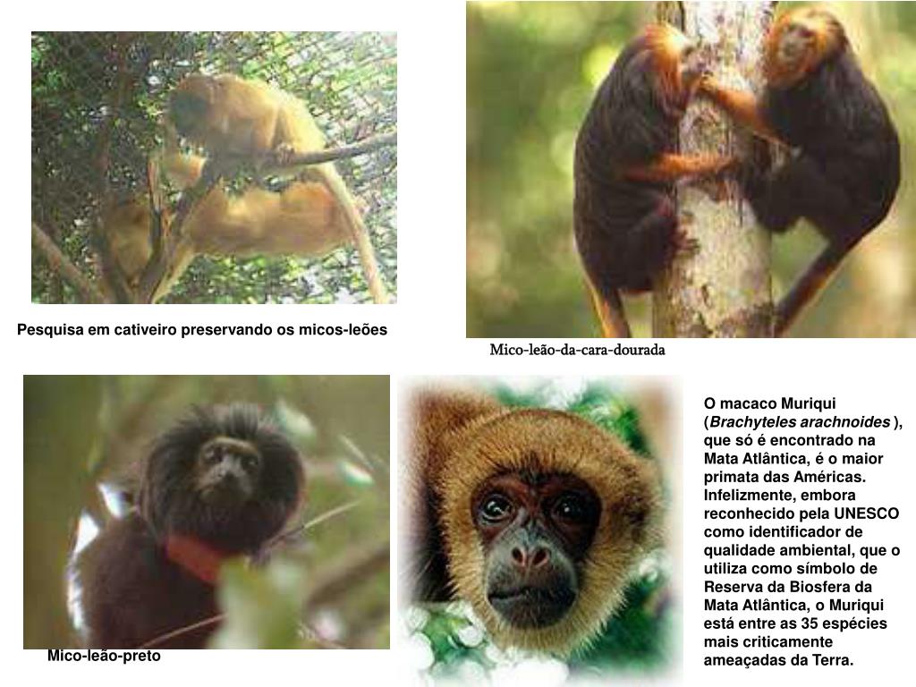 Pesquisa em cativeiro preservando os micos-leões Mico-leão-da-cara-dourada O macaco Muriqui (Brachyteles arachnoides ), que só é encontrado na Mata Atlântica, é o maior primata das Américas. Infelizmente, embora reconhecido pela UNESCO como identificador de qualidade ambiental, que o utiliza como símbolo de Reserva da Biosfera da Mata Atlântica, o Muriqui está entre as 35 espécies mais criticamente ameaçadas da Terra. Mico-leão-preto