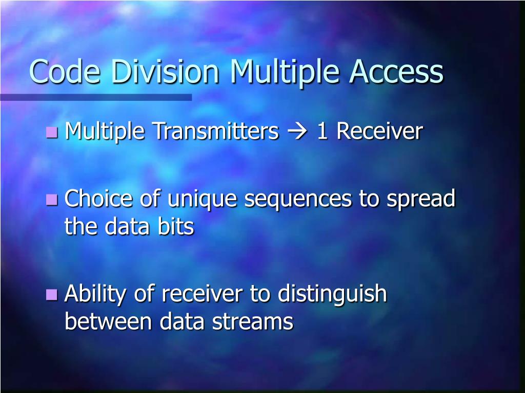 Code Division Multiple Access • Multiple Transmitters 1 Receiver • Choice of unique sequences to spread the data bits • Ability of receiver to distinguish between data streams
