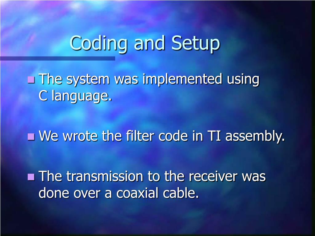 Coding and Setup • The system was implemented using C language. • We wrote the filter code in TI assembly. • The transmission to the receiver was done over a coaxial cable.