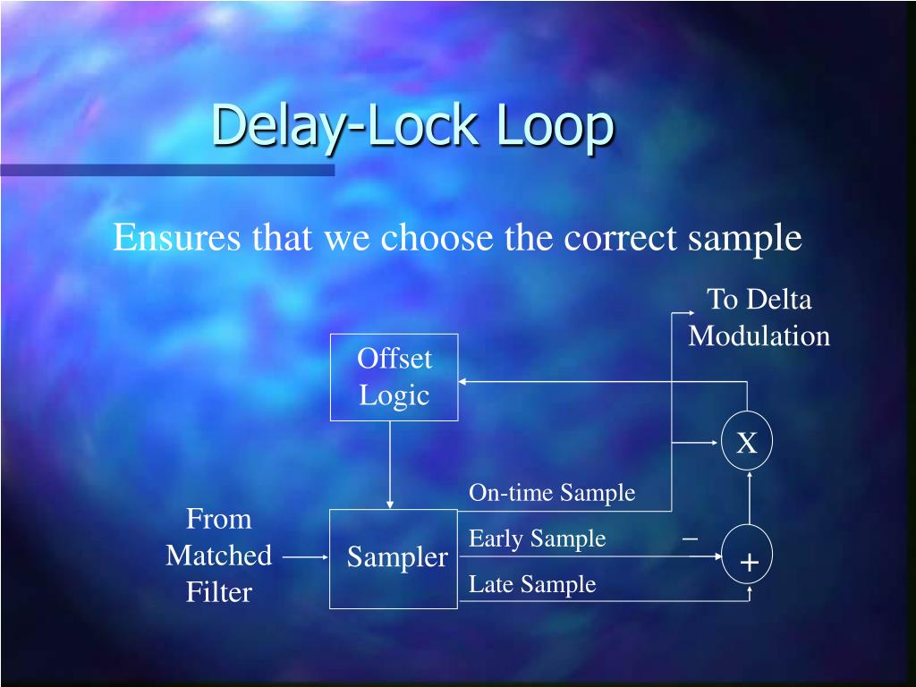 Delay-Lock Loop Ensures that we choose the correct sample To Delta Modulation Offset Logic X On-time Sample From Matched Filter _ Early Sample Sampler + Late Sample