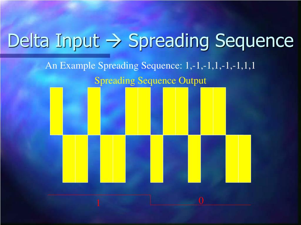 Delta Input Spreading Sequence An Example Spreading Sequence: 1,-1,-1,1,-1,-1,1,1 Spreading Sequence Output 0 1