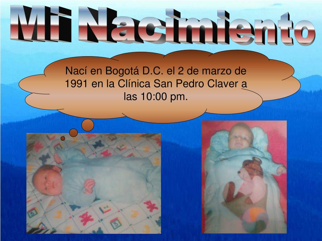 Mi Nacimiento Nací en Bogotá D.C. el 2 de marzo de 1991 en la Clínica San Pedro Claver a las 10:00 pm.