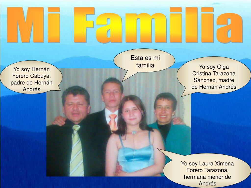 Mi Familia Esta es mi familia Yo soy Olga Cristina Tarazona Sánchez, madre de Hernán Andrés Yo soy Hernán Forero Cabuya, padre de Hernán Andrés Yo soy Laura Ximena Forero Tarazona, hermana menor de Andrés
