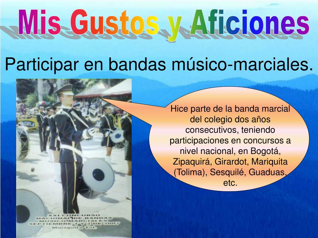 Mis Gustos y Aficiones Participar en bandas músico-marciales. Hice parte de la banda marcial del colegio dos años consecutivos, teniendo participaciones en concursos a nivel nacional, en Bogotá, Zipaquirá, Girardot, Mariquita (Tolima), Sesquilé, Guaduas, etc.