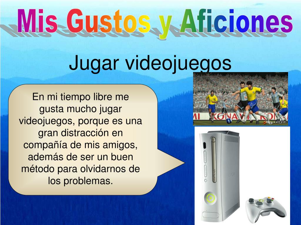 Mis Gustos y Aficiones Jugar videojuegos En mi tiempo libre me gusta mucho jugar videojuegos, porque es una gran distracción en compañía de mis amigos, además de ser un buen método para olvidarnos de los problemas.