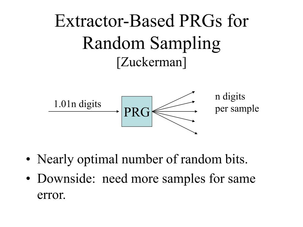 Extractor-Based PRGs for Random Sampling[Zuckerman] • Nearly optimal number of random bits. • Downside: need more samples for same error. n digits per sample 1.01n digits PRG