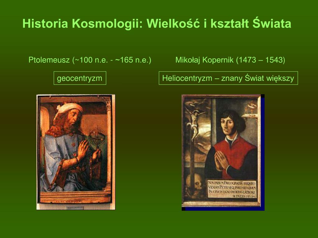 Historia Kosmologii: Wielkość i kształt Świata • Ptolemeusz (~100 n.e. - ~165 n.e.) Mikołaj Kopernik (1473 – 1543) geocentryzm Heliocentryzm – znany Świat większy