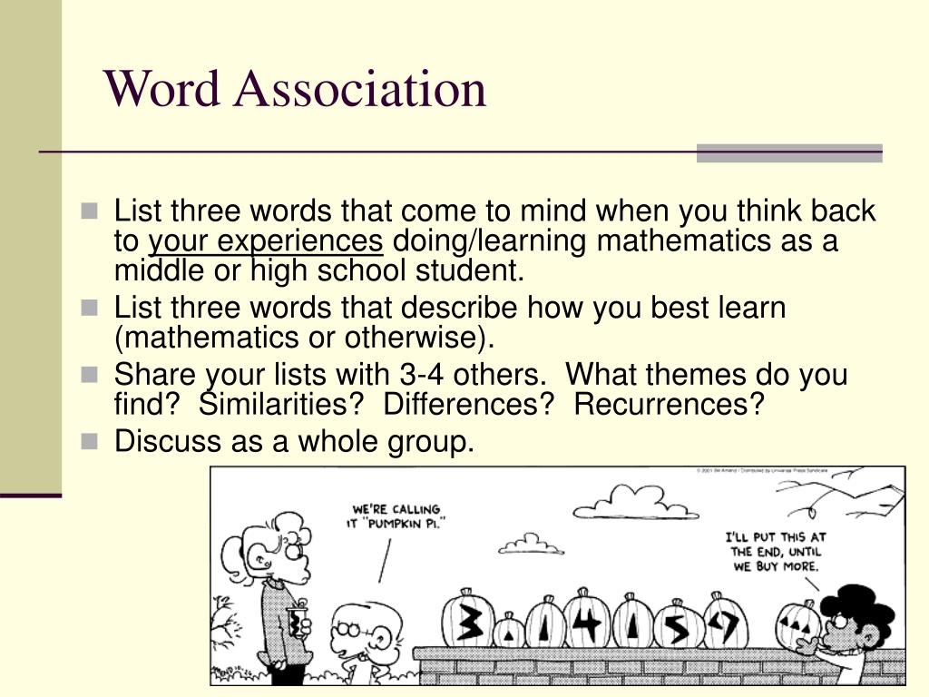 Word Association • List three words that come to mind when you think back to your experiences doing/learning mathematics as a middle or high school student. • List three words that describe how you best learn (mathematics or otherwise). • Share your lists with 3-4 others. What themes do you find? Similarities? Differences? Recurrences? • Discuss as a whole group.