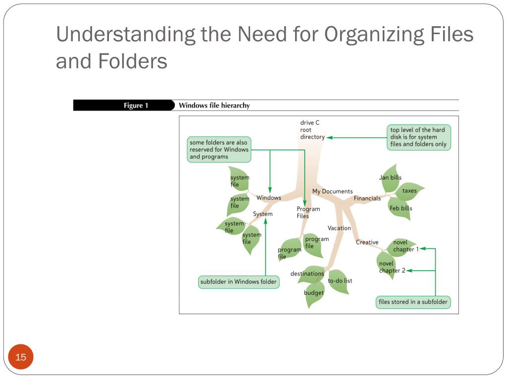 Understanding the Need for Organizing Files • Windows (and all other operating systems) organizes folders and files in an hierarchy, or file system • Windows stores the folders and important files it needs to turn on the computer in its root directory • Folders stored within other folders are called subfolders