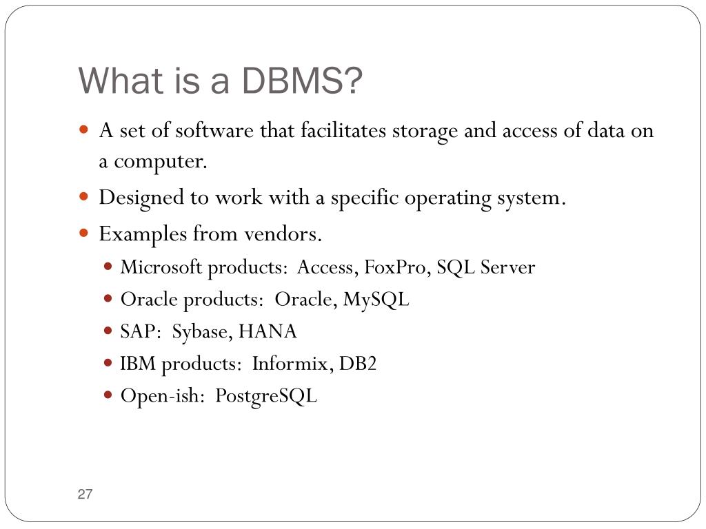What is a DBMS? • A set of software that facilitates storage and access of data on a computer. • Designed to work with a specific operating system. • Examples from vendors. • Microsoft products: Access, FoxPro, SQL Server • Oracle products: Oracle, MySQL • SAP: Sybase, HANA • IBM products: Informix, DB2 • Open-ish: PostgreSQL