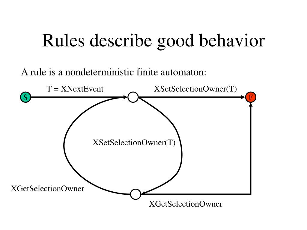 Rules describe good behavior A rule is a nondeterministic finite automaton: T = XNextEvent XSetSelectionOwner(T) S F XSetSelectionOwner(T) XGetSelectionOwner XGetSelectionOwner
