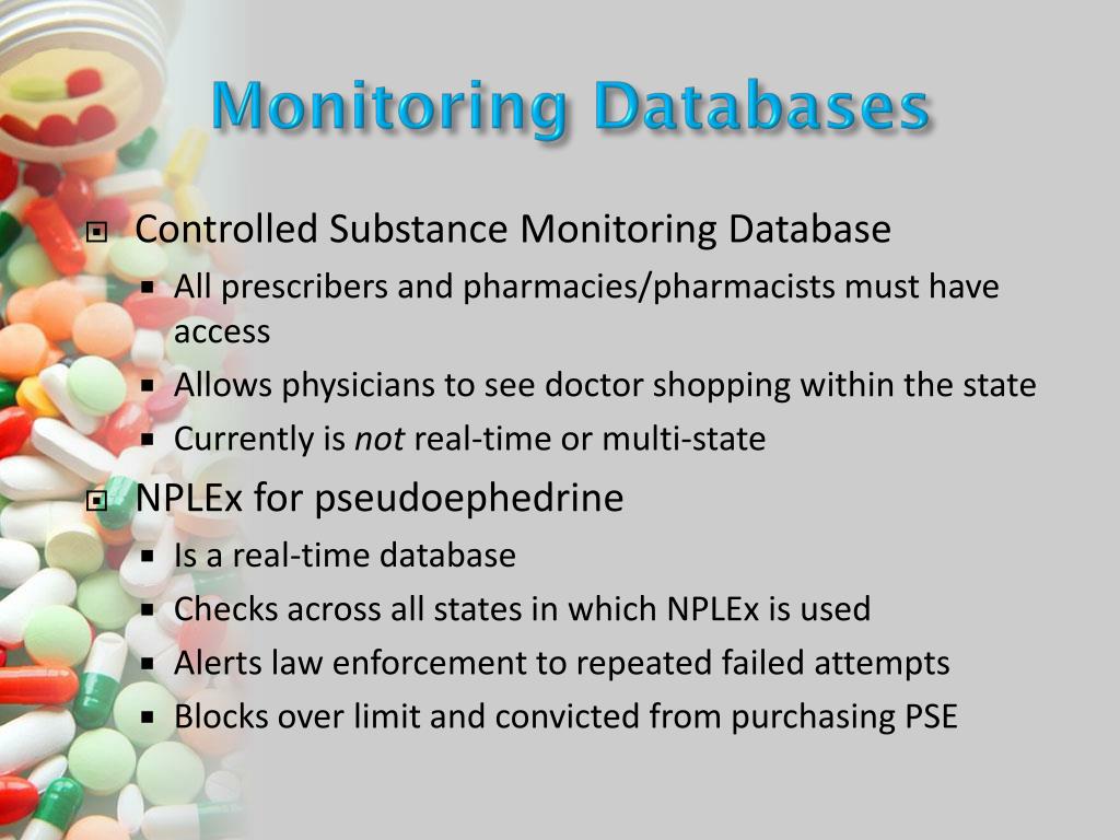 Monitoring Databases • Controlled Substance Monitoring Database • All prescribers and pharmacies/pharmacists must have access • Allows physicians to see doctor shopping within the state • Currently is not real-time or multi-state • NPLEx for pseudoephedrine • Is a real-time database • Checks across all states in which NPLEx is used • Alerts law enforcement to repeated failed attempts • Blocks over limit and convicted from purchasing PSE