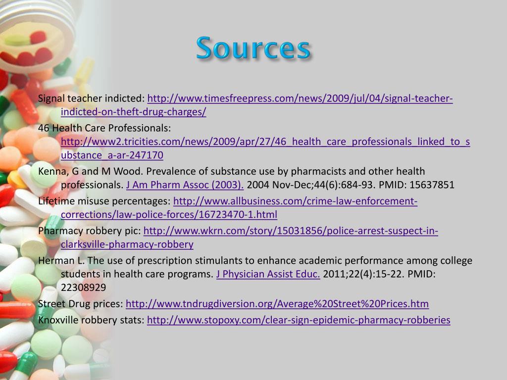Sources Signal teacher indicted: http://www.timesfreepress.com/news/2009/jul/04/signal-teacher-indicted-on-theft-drug-charges/ 46 Health Care Professionals: http://www2.tricities.com/news/2009/apr/27/46_health_care_professionals_linked_to_substance_a-ar-247170 Kenna, G and M Wood. Prevalence of substance use by pharmacists and other health professionals. J Am Pharm Assoc (2003). 2004 Nov-Dec;44(6):684-93. PMID: 15637851 Lifetime misuse percentages: http://www.allbusiness.com/crime-law-enforcement-corrections/law-police-forces/16723470-1.html Pharmacy robbery pic: http://www.wkrn.com/story/15031856/police-arrest-suspect-in-clarksville-pharmacy-robbery Herman L. The use of prescription stimulants to enhance academic performance among college students in health care programs. J Physician Assist Educ. 2011;22(4):15-22. PMID: 22308929 Street Drug prices: http://www.tndrugdiversion.org/Average%20Street%20Prices.htm Knoxville robbery stats: http://www.stopoxy.com/clear-sign-epidemic-pharmacy-robberies