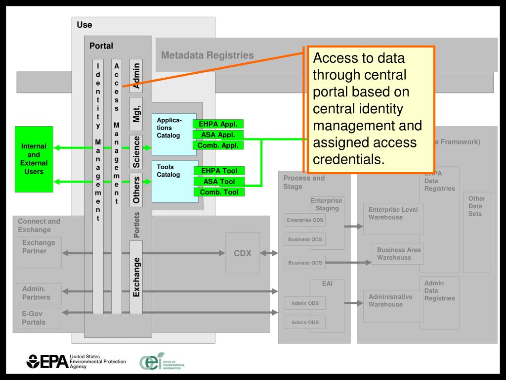 Admin Mgt, Applica- tions Catalog EHPA Appl. ASA Appl. Science Comb. Appl. Tools Catalog EHPA Tool ASA Tool Others Comb. Tool Portlets Exchange Use Portal Metadata Registries I d e n t i t y M a n a g e m e n t A c c e s s M a n a g e m e n t Warehousing system provides for enterprise access to all EPA data, including ERDMS, based on assigned access credentials. Internal and External Users Store for Use (Enterprise Warehouse Framework) EHPA Data Registries Process and Stage Other Data Sets Enterprise Staging Enterprise Level Warehouse Enterprise ODS Connect and Exchange CDX Business ODS Exchange Partner Business Area Warehouse Business ODS Admin Data Registries EAI Admin. Partners Administrative Warehouse Admin ODS E-Gov Portals Admin ODS