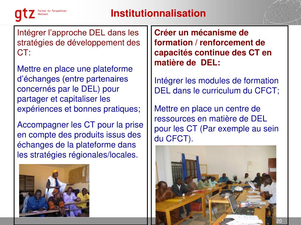 Intégrer l’approche DEL dans les stratégies de développement des CT: Mettre en place une plateforme d’échanges (entre partenaires concernés par le DEL) pour partager et capitaliser les expériences et bonnes pratiques; Accompagner les CT pour la prise en compte des produits issus des échanges de la plateforme dans les stratégies régionales/locales. Créer un mécanisme de formation / renforcement de capacités continue des CT en matière de DEL: Intégrer les modules de formation DEL dans le curriculum du CFCT; Mettre en place un centre de ressources en matière de DEL pour les CT (Par exemple au sein du CFCT). Institutionnalisation