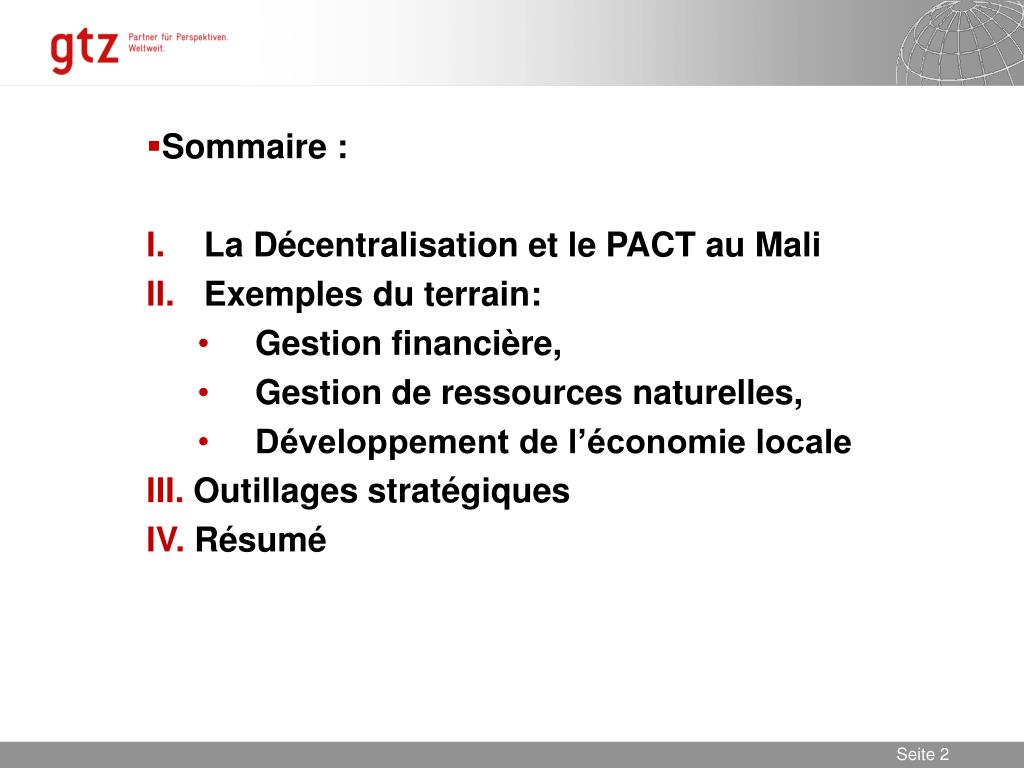 Sommaire : • La Décentralisation et le PACT au Mali • Exemples du terrain: • Gestion financière, • Gestion de ressources naturelles, • Développement de l’économie locale III. Outillages stratégiques IV. Résumé