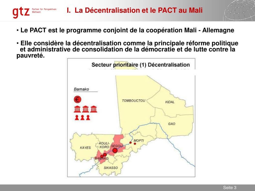 I. La Décentralisation et le PACT au Mali • Le PACT est le programme conjoint de la coopération Mali - Allemagne • Elle considère la décentralisation comme la principale réforme politique et administrative de consolidation de la démocratie et de lutte contre la pauvreté.