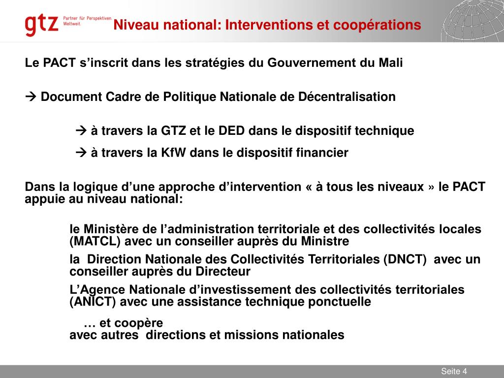 Niveau national: Interventions et coopérations Le PACT s’inscrit dans les stratégies du Gouvernement du Mali Document Cadre de Politique Nationale de Décentralisation à travers la GTZ et le DED dans le dispositif technique à travers la KfW dans le dispositif financier Dans la logique d’une approche d’intervention « à tous les niveaux » le PACT appuie au niveau national: le Ministère de l’administration territoriale et des collectivités locales (MATCL) avec un conseiller auprès du Ministre la Direction Nationale des Collectivités Territoriales (DNCT) avec un conseiller auprès du Directeur L’Agence Nationale d’investissement des collectivités territoriales (ANICT) avec une assistance technique ponctuelle … et coopère avec autres directions et missions nationales