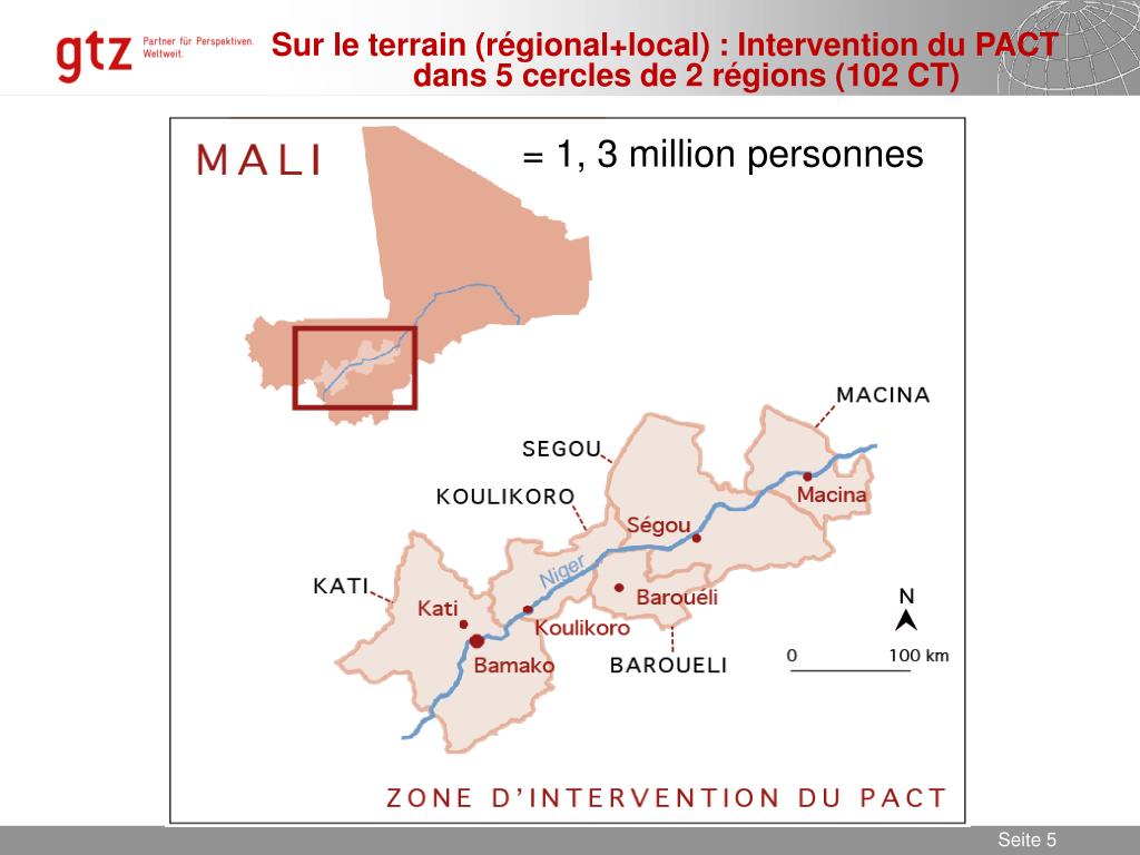 = 1, 3 million personnes Sur le terrain (régional+local) : Intervention du PACT dans 5 cercles de 2 régions (102 CT)