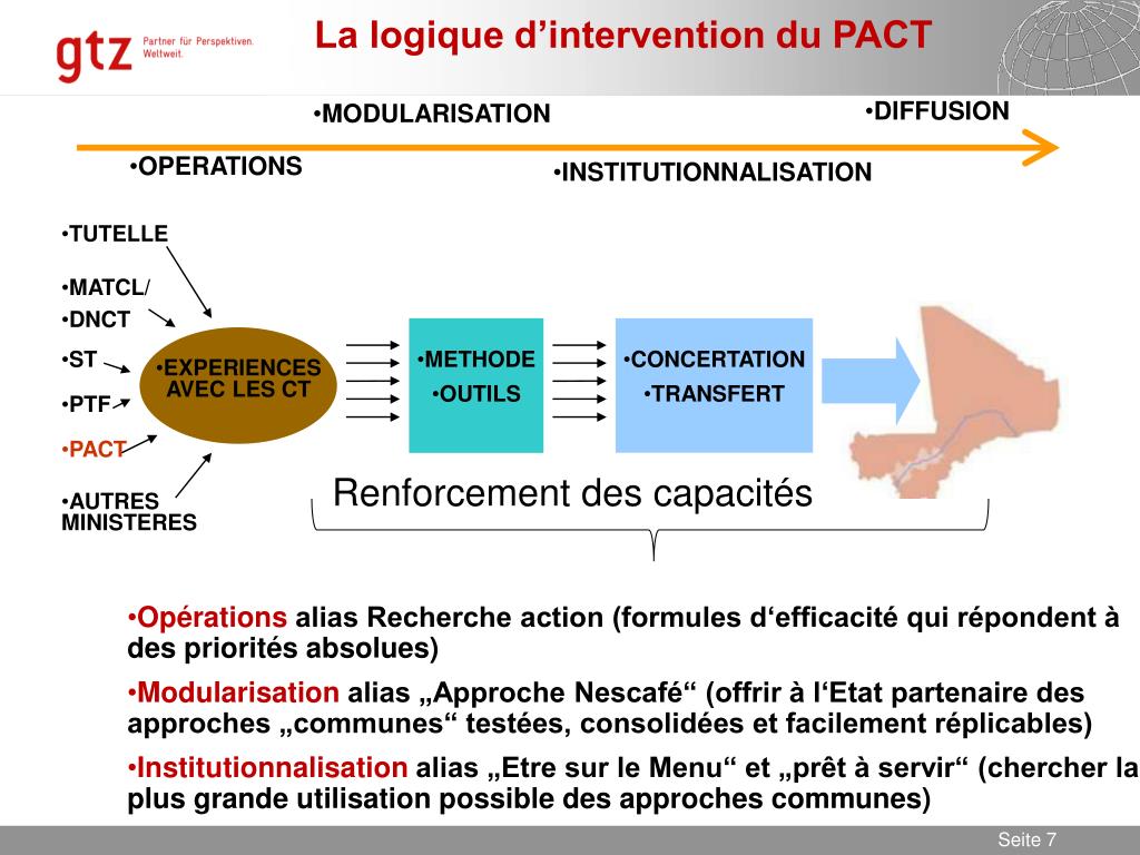 La logique d’intervention du PACT DIFFUSION MODULARISATION OPERATIONS • INSTITUTIONNALISATION TUTELLE MATCL/ DNCT ST METHODE OUTILS • CONCERTATION • TRANSFERT EXPERIENCES AVEC LES CT PTF PACT Renforcement des capacités AUTRES MINISTERES • Opérations alias Recherche action (formules d‘efficacité qui répondent à des priorités absolues) • Modularisation alias „Approche Nescafé“ (offrir à l‘Etat partenaire des approches „communes“ testées, consolidées et facilement réplicables) • Institutionnalisation alias „Etre sur le Menu“ et „prêt à servir“ (chercher la plus grande utilisation possible des approches communes)