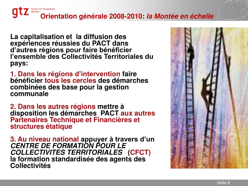 Orientation générale 2008-2010: la Montée en échelle La capitalisation et la diffusion des expériences réussies du PACT dans d’autres régions pour faire bénéficier l’ensemble des Collectivités Territoriales du pays: 1.Dans les régions d’intervention faire bénéficier tous les cercles des démarches combinées des base pour la gestion communale 2.Dans les autres régions mettre à disposition les démarches PACT aux autres Partenaires Technique et Financières et structures étatique 3.Au niveau national appuyer à travers d’un CENTRE DE FORMATION POUR LE COLLECTIVITES TERRITORIALES (CFCT) la formation standardisée des agents des Collectivités