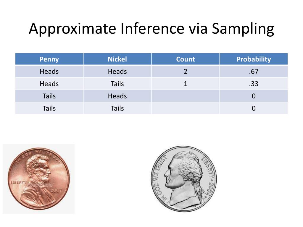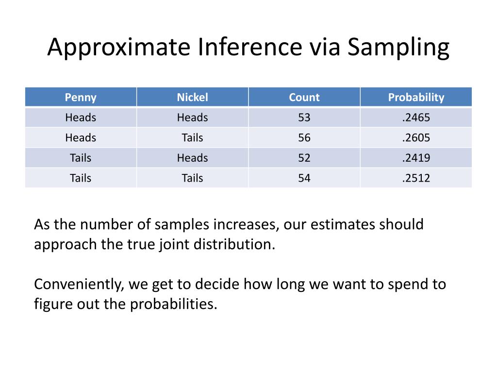 Approximate Inference via Sampling As the number of samples increases, our estimates should approach the true joint distribution. Conveniently, we get to decide how long we want to spend to figure out the probabilities.