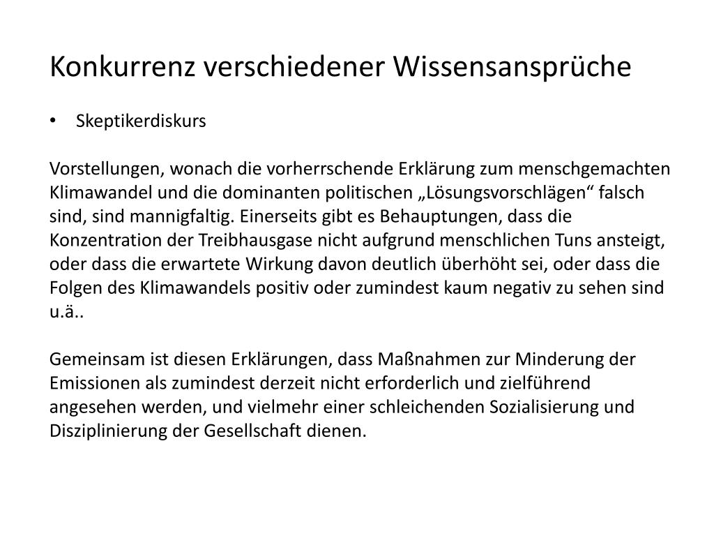 KonkurrenzverschiedenerWissensansprüche • Skeptikerdiskurs • Vorstellungen, wonach die vorherrschende Erklärung zum menschgemachten Klimawandel und die dominanten politischen „Lösungsvorschlägen“ falsch sind, sind mannigfaltig. Einerseits gibt es Behauptungen, dass die Konzentration der Treibhausgase nicht aufgrund menschlichen Tuns ansteigt, oder dass die erwartete Wirkung davon deutlich überhöht sei, oder dass die Folgen des Klimawandels positiv oder zumindest kaum negativ zu sehen sind u.ä.. • Gemeinsam ist diesen Erklärungen, dass Maßnahmen zur Minderung der Emissionen als zumindest derzeit nicht erforderlich und zielführend angesehen werden, und vielmehr einer schleichenden Sozialisierung und Disziplinierung der Gesellschaft dienen.